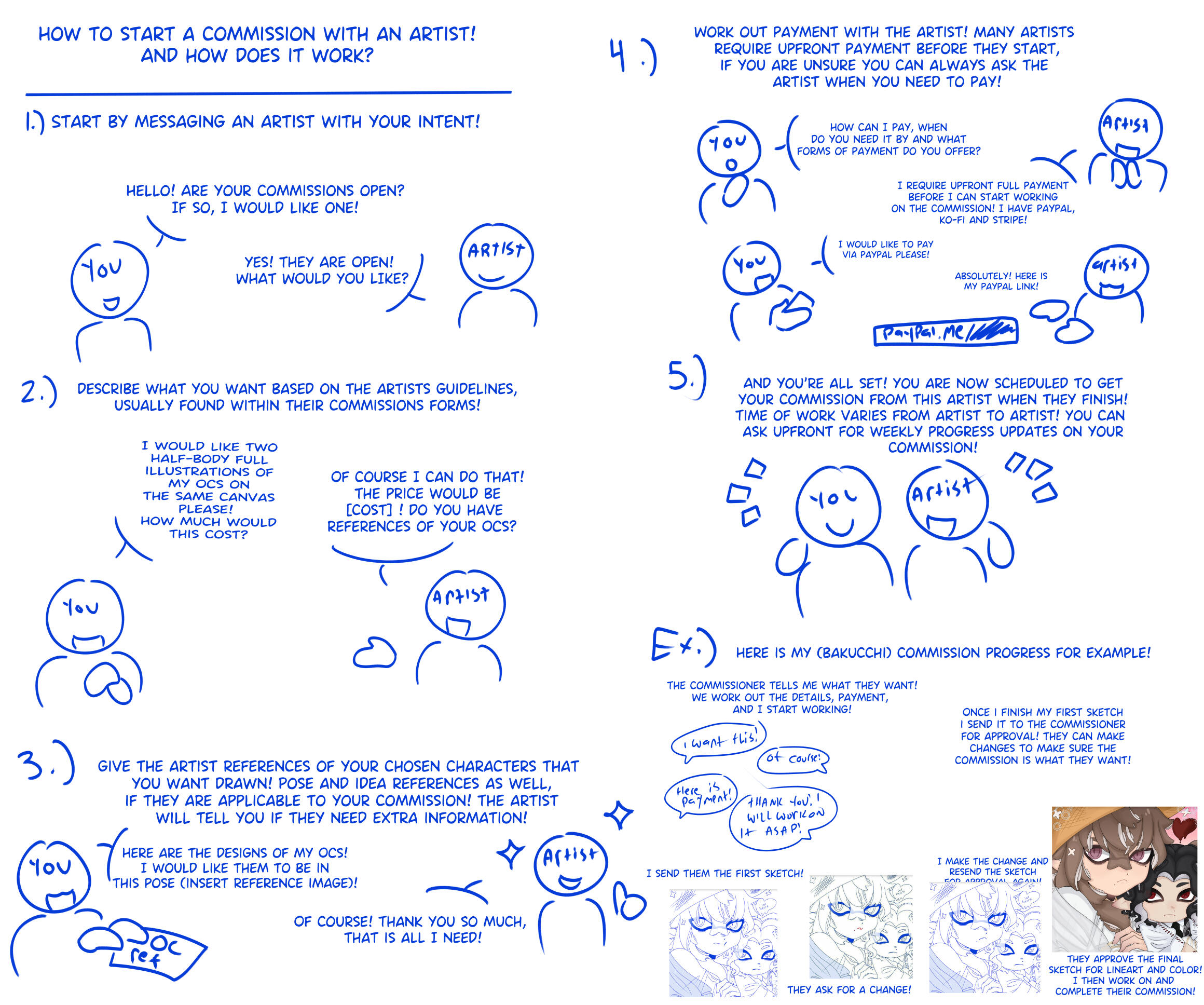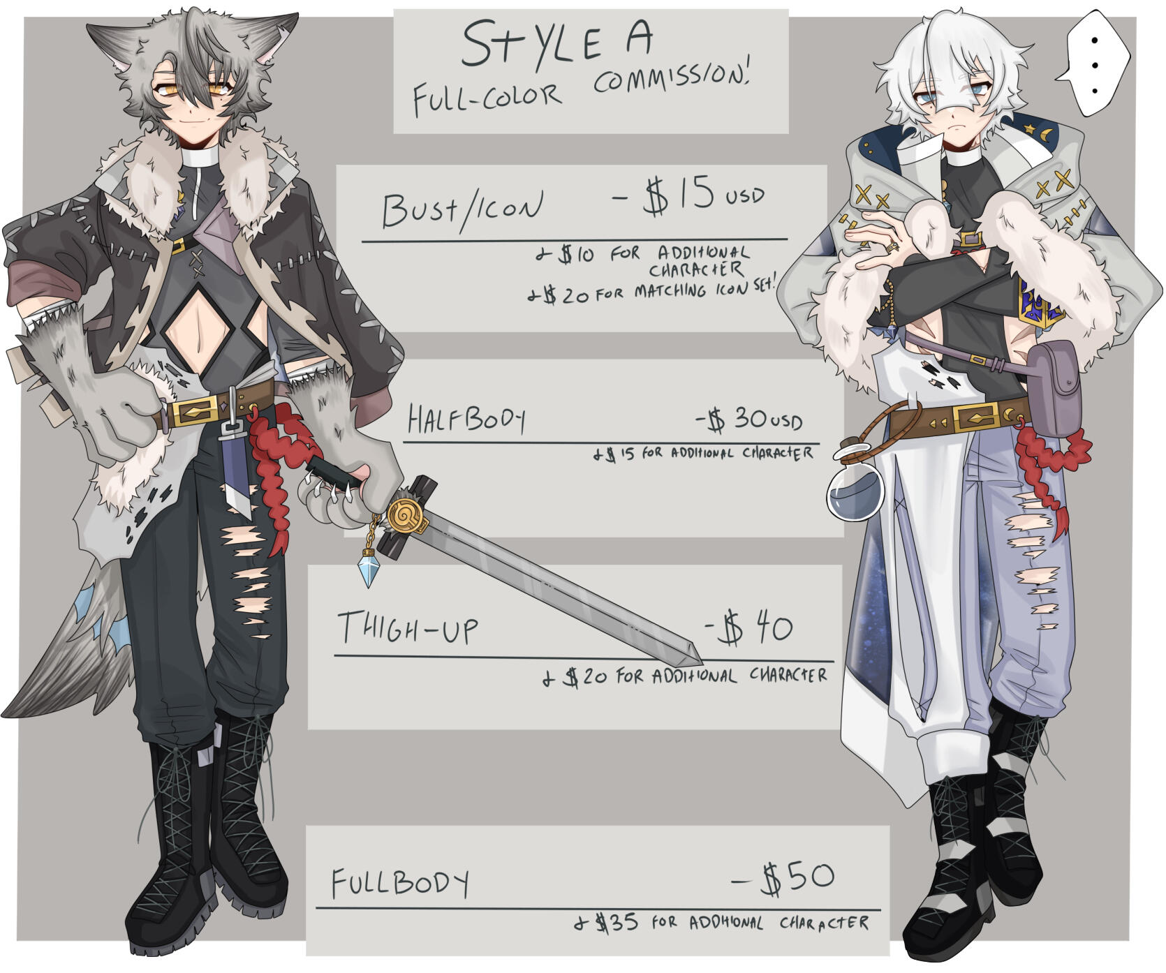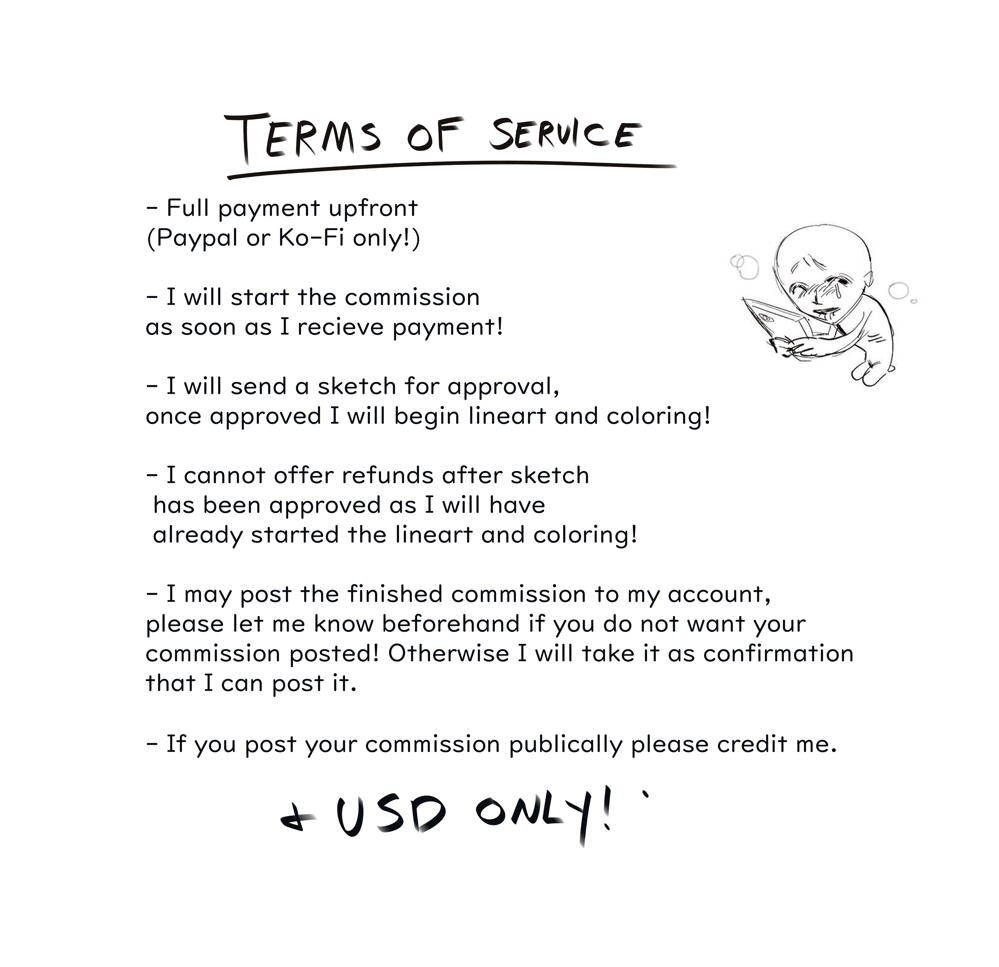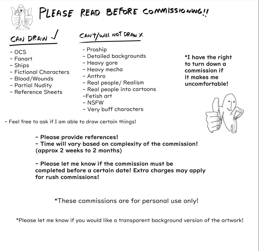 - I take full payment upfront and will only start on the commission once it is fully paid!- Payment Methods: Paypal and Ko-fi- I have the right to turn down a commission if it makes me uncomfortable!- Commissions can take from 2 weeks to 1 month, I am a college student so my schedule gets busy during the semesters! I will contact you in advance about any delays!- I will send a sketch for approval to your confirmed place of contact, one it is approved lineart and coloring will begin!- I can do RUSH commissions! If there is a deadline you need the piece finished by please tell me in advance and there will be a rush commission fee applied! (Determined based on how quickly you need the piece done and how complex it is!)- Please provide references, I can do custom designs but there will be added fees so please contact me.- Commissions are for personal use, please contact me for commercial inquiries!- I post watermarked versions of commissions after I complete them, please tell me in advance if you do not want your commission posted!- Please credit me if you post your commission anywhere publically!- I do not support AI or NFT, I do not allow for my art to be used for these purposes.